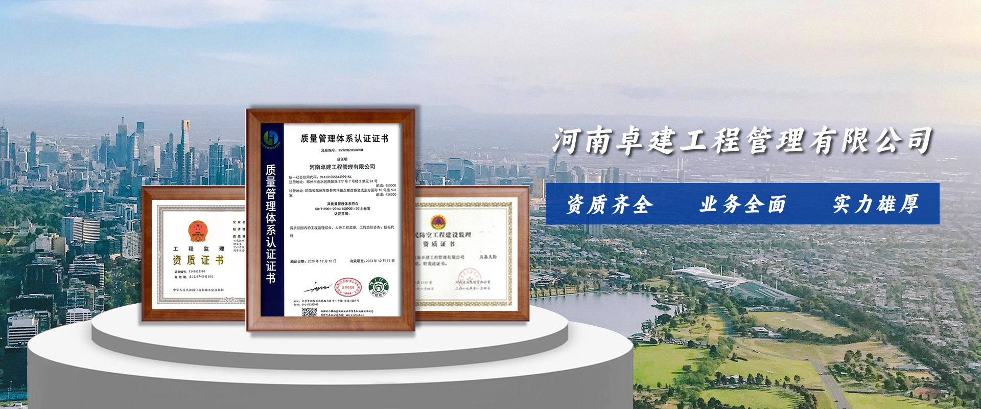 河南卓建工程管理有限公司(前身名為河南卓建建筑工程監(jiān)理有限公司)是經(jīng)鄭州市工商行政管理局批準,成立于2011年,經(jīng)營業(yè)務范圍包括建筑工程監(jiān)理、工程監(jiān)理、工程項目管理、招標代理、造價咨詢等,具有工程監(jiān)理綜合資質、人防工程丙級資質、造價咨詢資質乙級。公司已通過質量管理體系認證、職業(yè)健康安全管理體系認證、環(huán)境管理體系認證,公司是河南省監(jiān)理協(xié)會會員單位。
